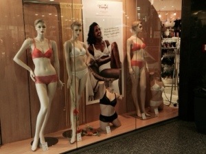 Menu placed in window at sidewalk. About three feet by three feet in size.